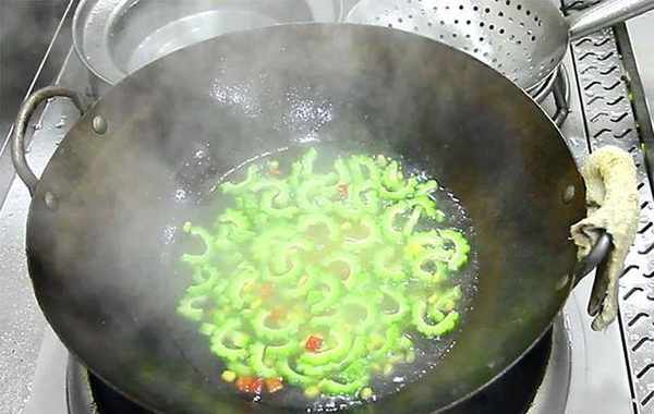 4.锅里倒入植物油,倒入葱蒜红辣椒爆香,再倒入焯过水的苦瓜和玉米粒,快速翻炒片刻,加入适量的食盐、胡椒粉,翻炒花开调料以后勾入水淀粉,开大火翻炒收一下汤汁,翻炒几下即可出锅,美味即成。