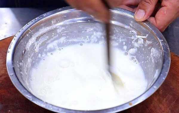 2.碗中打入2个鸡蛋,快速搅散成鸡蛋液;准备一个小盆,放入一小勺淀粉和适量的面粉,多次少量地加入清水,搅成细腻的面糊。