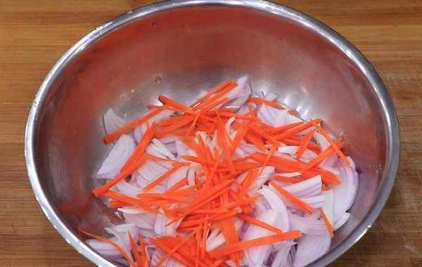1.准备洗净的小洋葱三个,切成细丝。胡萝卜半根,也切成细丝,放在同一个盆中。