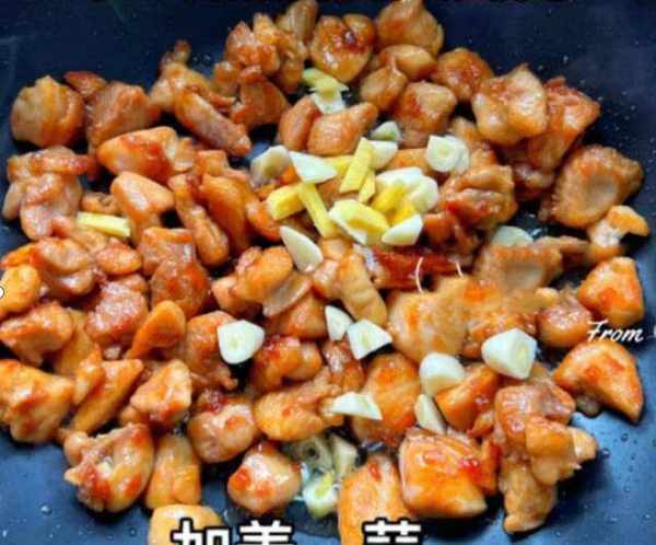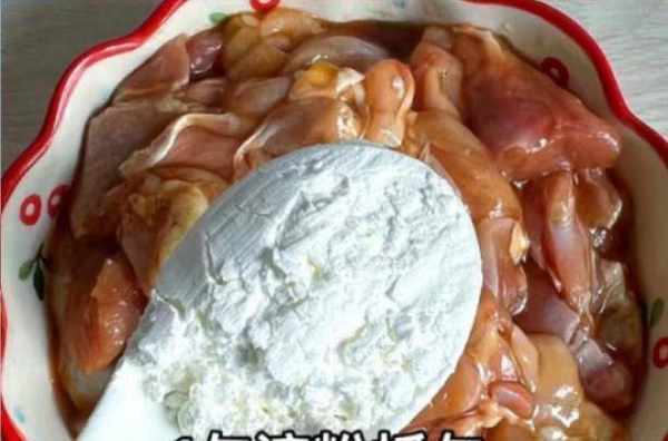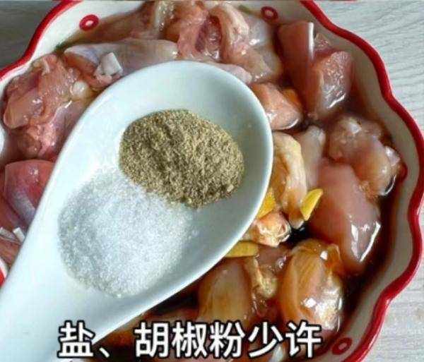 步骤2:鸡肉用清水洗干净,鸡腿肉切成若干小丁,鸡肉全部放在容器里,放入一些姜丝,加上一勺生抽,加上一勺料酒去腥,加上食盐和胡椒粉少许,加上一勺红薯淀粉,用手迅速抓均匀,腌制10分钟左右。