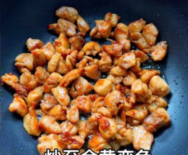 步骤4:提前将锅底慢慢烧热,倒入腌制好的鸡腿肉,迅速翻炒一会儿,将鸡腿肉煎至金黄。