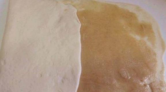 冷水和面,温水兑酵母加入,然后放在比较暖的地方发面30分钟。擀开后均匀的涂上一层油酥,平行对折成三层。