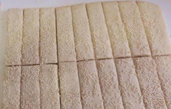 擀成面饼后,上面喷一点水,撒上白芝麻,用刀切成细长的面条。