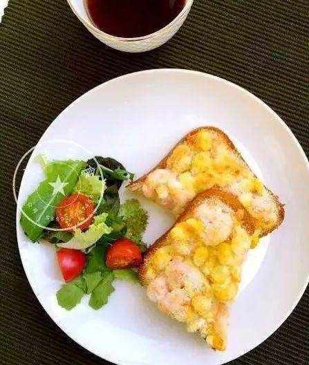 3. 好乐门专业烹调沙拉酱、好乐门纯正蛋黄酱、蜂蜜调匀抹在面包上,撒上玉米粒按实改刀装盘即可。