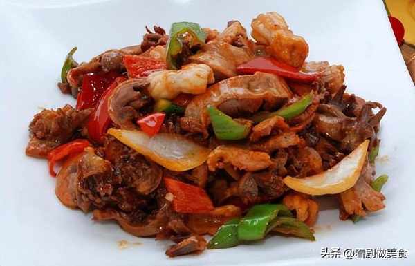 猪肚头100克,鸡胗100克,青尖椒、红尖椒各10克