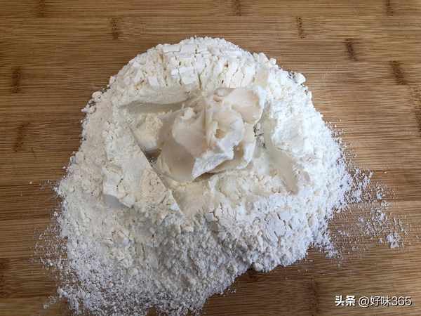 2.接着做油酥,把低筋面粉倒在案板上,筑成粉墙,加入猪油。