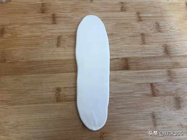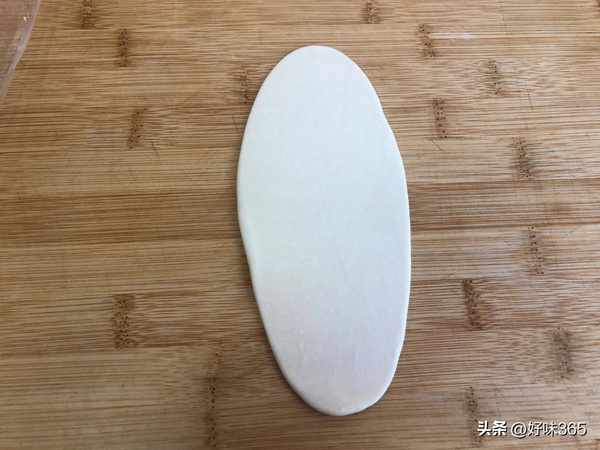 8.采用的是小包酥的手法,先进行第一次擀卷,将小面团底部向上按扁,上下擀开成椭圆形面皮。