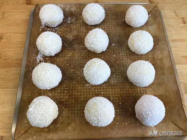 14.收口捏紧,整成圆形,底部向下放在烤盘上。饼皮表面刷上少许清水,并滚上一层椰蓉,放入烤箱以上火180度,下火160度烤约15分钟,中途调转烤盘并加盖锡纸,再烤约10——15分钟,至表面金黄、边缘酥硬即可。
