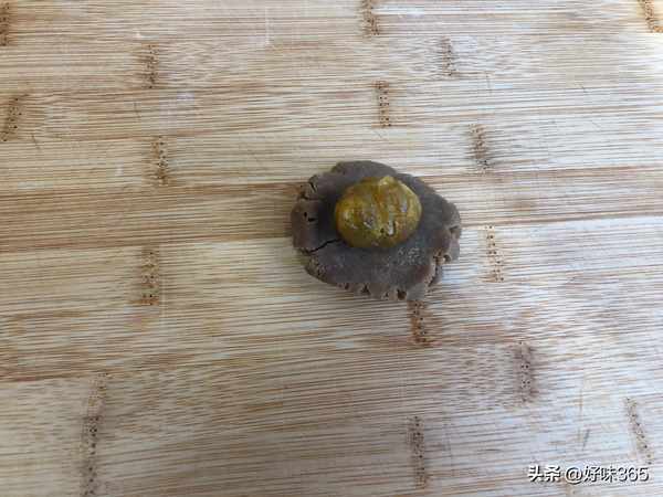 4.最后准备内馅,栗子泥分成30克一个,包入一整颗糖渍栗子。(我的栗子泥是买现成的,糖渍栗子是将生栗子加入适量黄冰糖煮熟即可。如果自己炒制栗子泥,一定要炒干,太软不好操作。)