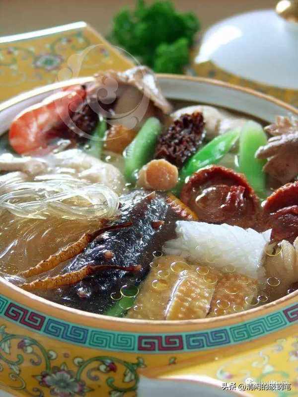 三是使用蒸炖法,它是将装好的原料的密封钵放在沸滚的蒸笼上蒸炖的,其效果与不隔水炖基本相同,但因蒸炖的温度校高,必须掌握好蒸的时间。蒸的时间不足,会使原料不熟和少香鲜味道;蒸的时间过长,也会使原料过于熟烂和散失香鲜滋味,此蒸炖方法较多的使用在制作原料高档的菜品时运用。总之炖制菜品的品种很多,要做出有特色的,就需要根据具体的菜肴去选料、调味、并且掌握火候,以做到汤鲜味醇、突出原料自身特点。由于各地流行的炖制菜品以及方法不尽相同,下面,笔者仅把流行于成都地区的此类海味、海鲜炖菜介绍给大家。
