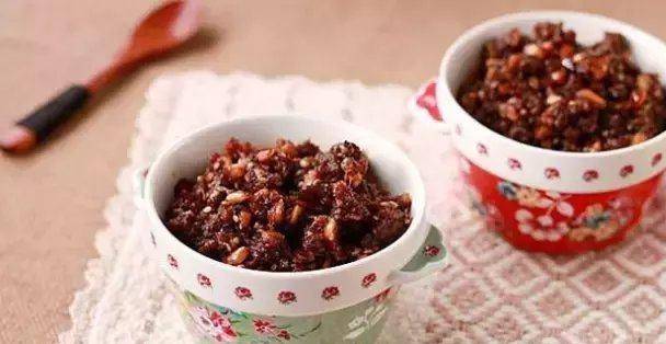 4、重新倒入香菇末,炒匀后小火再熬煮几分钟就能出锅,出锅前加入葱末、白芝麻。盛出放凉就能密封冷藏了~