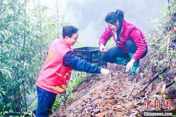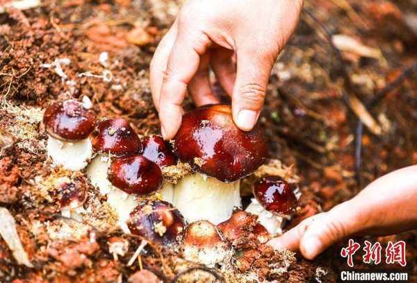 村民采摘新鲜出土的赤松茸。 窦森 摄