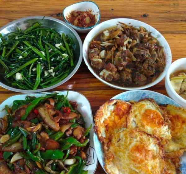 这边很爱吃这种辣辣的很爽口的辣椒,不和五花肉一起炒,配上猪头肉炒也很美味。猪头肉腌制过,本身就很入味,再炒一下更油润可口了。再来一个红烧排骨,说是红烧更像是油焖,油汪汪的有嚼劲,炸得很香。还有清炒空心菜和荷包蛋,也是特别丰富的一餐。
