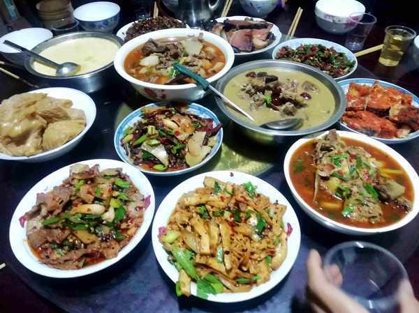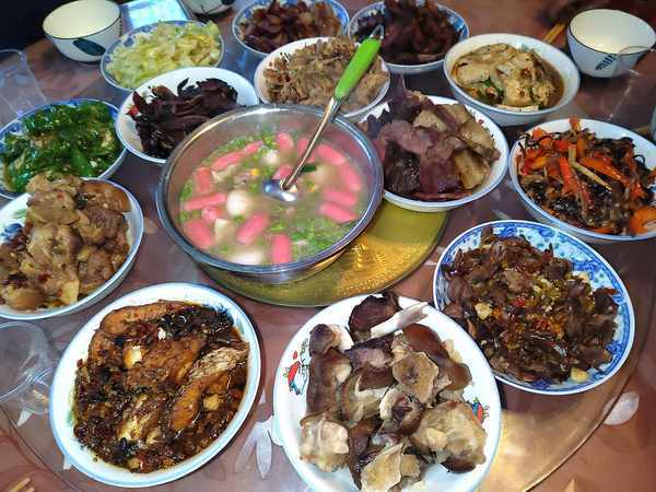 正月里一般都是女人掌勺,男人打牌、招呼客人等等,但是舅舅家却是例外。这桌菜是舅舅和舅妈一起完成的,有豆腐角、蒸蛋羹、蒸腊肉、霉鱼、羊肉等等,非常丰富。