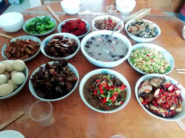 二叔一家也是上班族,但是婶婶从事的工作,与美食相关,所以饭菜做得特别好。秘制皮蛋、农家腊鸭、辣炒驴肉、辣炒扣肉、黄菜炒豌豆、墨鱼猪肚汤、蒸香肠、辣炒熏干、小炒菜苔、秘制霉鱼、辣炒鸡胗、农家腊鸡肉。这桌宴客菜很有特色,有很多都是在外面吃不到的,对于江西人来说,这就是家的味道。