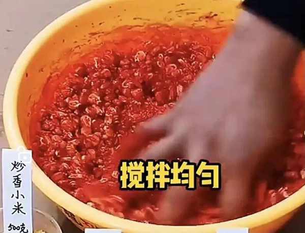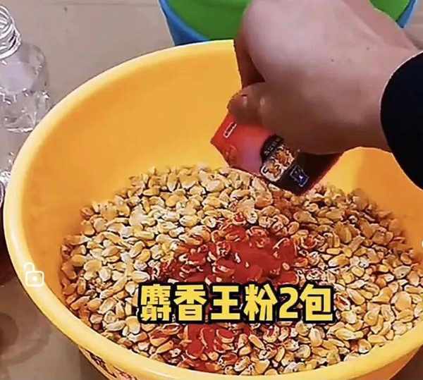 准备工作:以上原料,500克大米需綽水以下,小火煮3分钟捞出备用,500克小麦也需煮一下,煮制八成熟放凉备用,小米文火炒香备用,待部分原料完成初加工以后,我们就开始配制窝料,取个小盆先倒入老玉米1000克,再加依次加入大米、小米小麦。接着我们加入维生素b2两克,牛b鲫一包、麝香王粉两包、蜂蜜50克、DMPT诱食剂两克、最后加中药酒6克、高度曲酒250克。