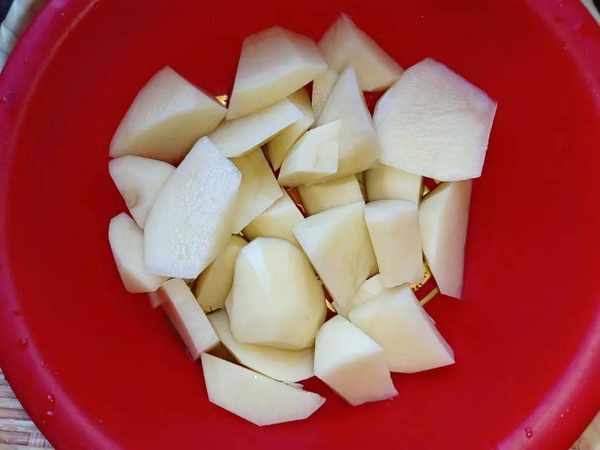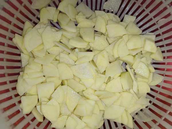 2.土豆表面容易有灰尘,将其放在水中冲洗干净,洗净后的土豆用削皮刀将其表皮去掉,然后再用清水洗净,洗净后的土豆放在案板上,用刀将其切成滚刀状,浸泡在水中;