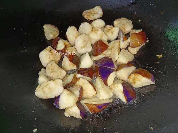 4.准备一个小碗,碗中放入适量的淀粉,将处理好的茄子裹上一层淀粉,裹好后放在盆中备用。煎土豆后锅中还有少量的油,再倒入适量的油,将处理好的茄子倒入里面,用小火慢慢煎煮,煎至两面金黄放在一旁备用;