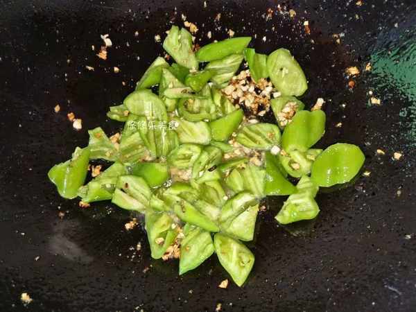 5.蒜泥倒入里面,小火将其煸炒出香味来,切好的青椒倒入里面,用铲子将它们翻炒均匀,炒香;