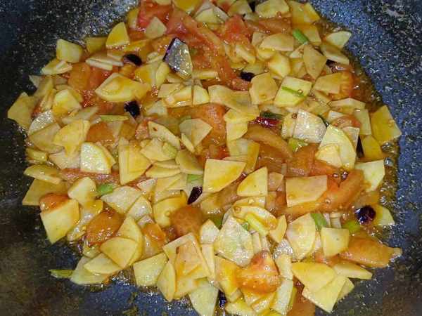 4.将洗净后的土豆片倒入锅中,用铲子将它们翻炒,西红柿炒的时候会有汁水出来,所以土豆下锅后可以不用再加水,但是火一定要关小一点,然后用小火慢慢翻焖焖煮,