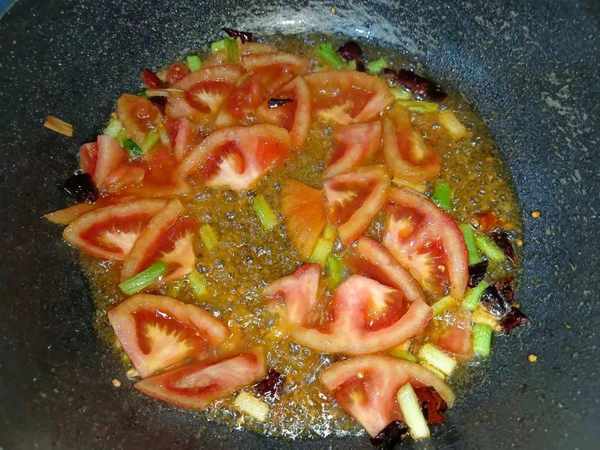 3.准备一个干净的锅,锅中的水分干后倒入适量的油。将辣椒根葱白下锅煸炒一下,经过煸炒辣椒根葱白会散发出香味,倒入切好后的西红柿。西红柿下锅后,用铲子将它翻动多炒一会,这样子西红柿就可以炒成泥;