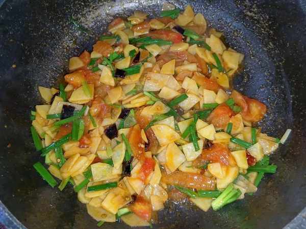 5.经过焖煮两三分钟,锅中的西红柿土豆片炒熟后,往里面加入适量的食盐,蚝油,鸡精调味,然后用铲子翻炒均匀,再出锅之前倒入切好后的葱花,炒均匀后即可关火。