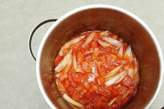 6.煸香洋葱后,放入切好的西红柿炒软。