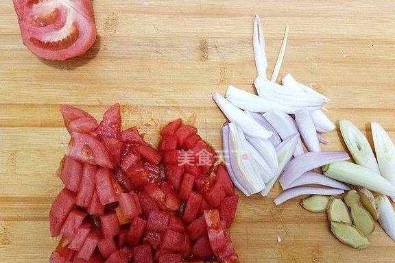2.西红柿去皮切成块、洋葱切丝、姜切片、葱切段。
