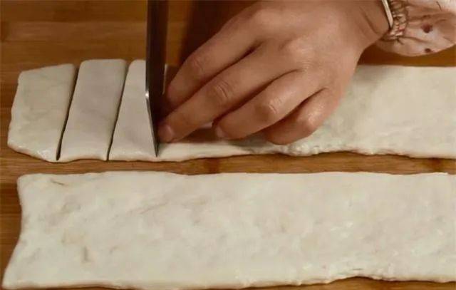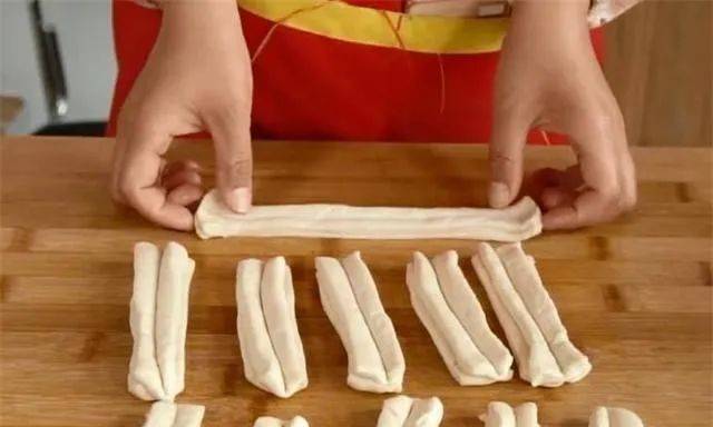 8.然后再将切好的面片两片对叠,用筷子在对叠面片的正中间压一下,这个时候我们的油条胚就做好了,这里要注意的是按压力度要适中,使中间部分粘合即可,按压过重会变形,按压过轻两个面片会分离。