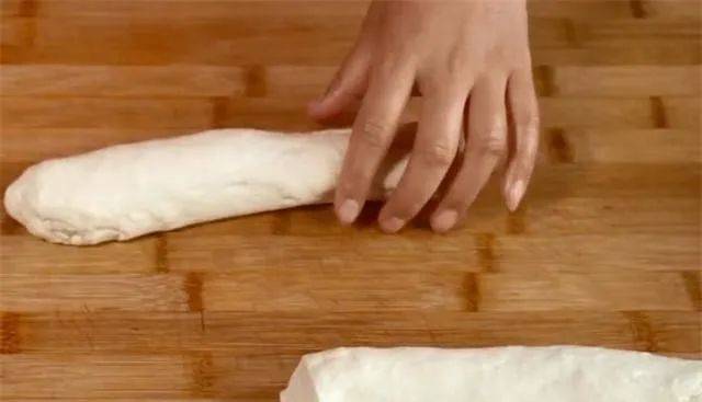 5.时间到后,在案板上刷上一层油,这样可以防止粘板,把醒好的面团拿出来,搓成长条,然后用刀从中间切开,分成大小相等的两段。