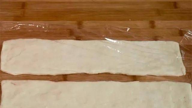 7.时间到后撕掉保鲜膜,将面片切成两厘米宽的小段。