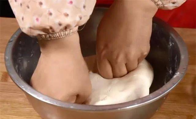 3.面团发酵好后取出来,用手像这样轻轻揣一下,再揉一会儿,面要揉得稍微软一些。