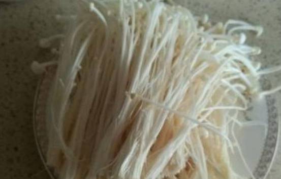 第二步就是把金针菇掰成这样的小朵。大小尽量均匀一些,这样制作过程中才不会出现夹生的情况,还需要注意的一点就是,掰的时候不要把根部白色,尽量还是连在一起。掰好之后用清水淘洗两遍,放在一遍控干水分。