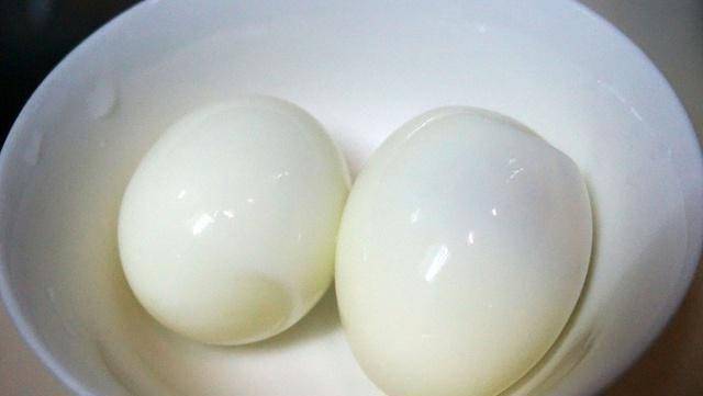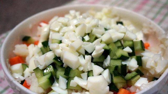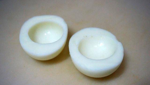 3.装满一壶水。等水凉了,把鸡蛋放进去煮。水开约5分钟后即可捞出,然后用冰水冲凉,去壳对半切开,取出蛋黄,蛋白切丁。