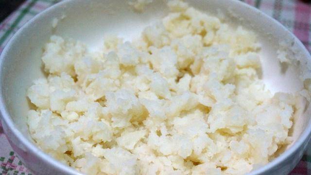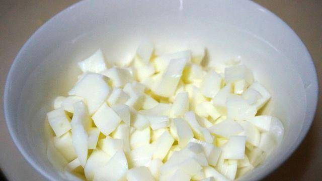 5、蒸好的土豆去皮,用勺子或叉子把土豆压碎,和胡萝卜丁一起放凉。