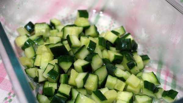 2、黄瓜洗净,切成小方块,抓上少许盐,沥干水分去青,过滤掉多余的水分,放入冰箱冷藏备用。