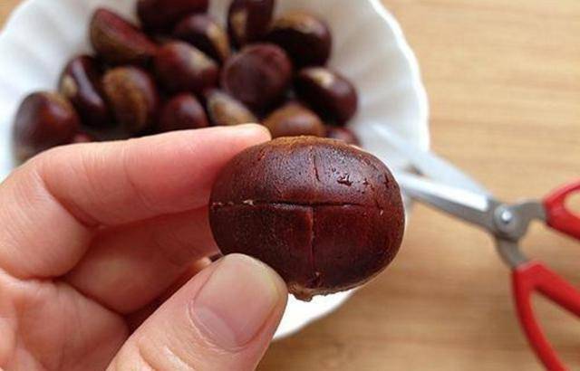 用剪刀在栗子凸起的部分轻轻剪一个十字。然后把水烧开,锅里煮熟栗子,记得加点盐。让栗子在水中焯一分钟左右,再让水烧开,捞出控水,不要用太冷的水,趁热挤栗子,栗子很容易剥皮。可以一次多剥一些,放入冰箱冷冻,需要的时候可以拿出来吃。