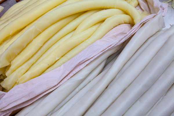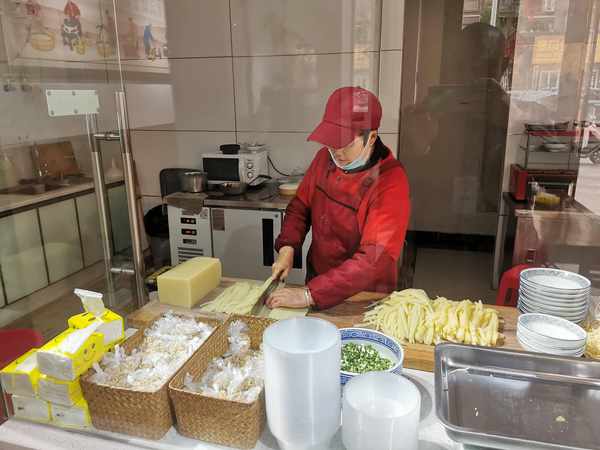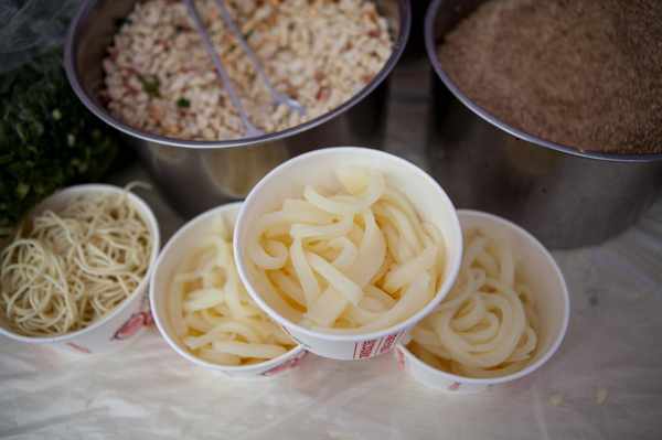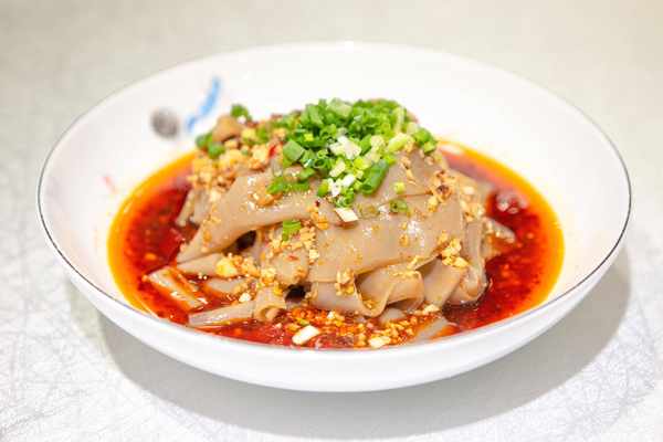 用上等大米磨成细浆,放入蒸笼薄摊均匀,蒸熟切条并加入各种调料拌均,味鲜色美。
