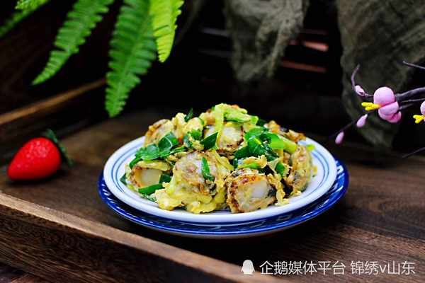 2.起锅烧油,放入鸡蛋扇贝丁,炒至定型。加入少许的盐翻炒。接着加入切好的韭菜段,快速翻炒到韭菜段变软即可。