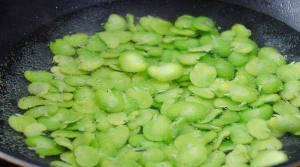 2、起锅烧油,油热后同时放入蚕豆和蒜苗,翻炒变得更翠绿,放入适量的盐调味,倒入一点清水,盖盖煮熟。