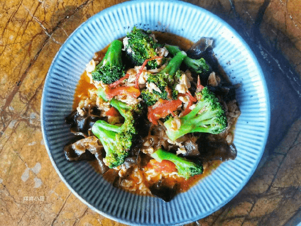 6、加入焯好水的西兰花和黑木耳一起翻炒均匀。