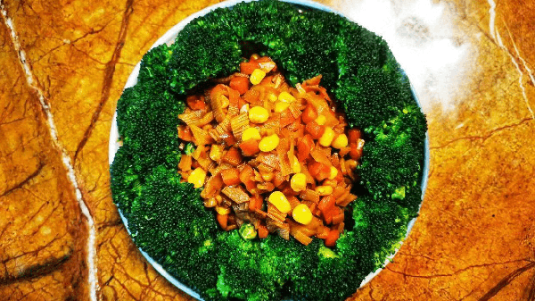 8、将炒好的蟹柳玉米粒倒入西兰花的中间位置,送进水开的蒸锅,蒸2——3分钟即可。