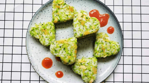所需食材:米饭半碗(要加了糯米的米饭),鳕鱼肠2根,西兰花3小朵,肉松适量,番茄酱少许。