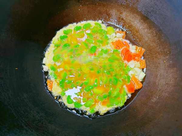 ⑥把蚕豆鸡蛋液倒入锅中,先开小火。底部鸡蛋液凝固后用铲子从底部向上铲起,再翻炒几下。