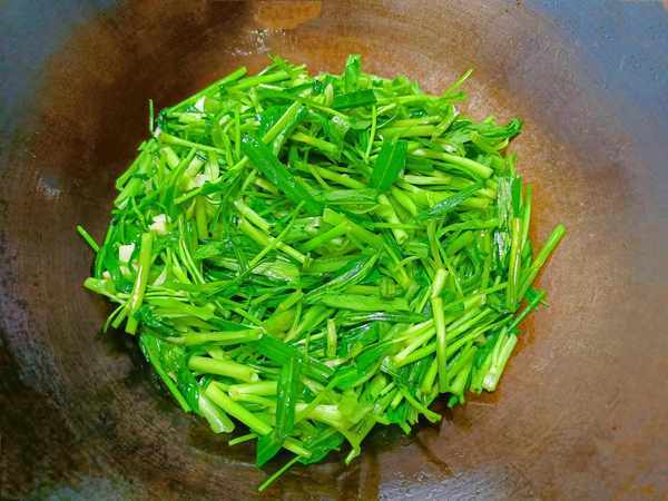 ③等空心菜的茎炒软后再把叶子放进去,开大火炒。