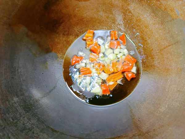 ⑤锅中烧油,把洗干净的辣椒和蒜末倒入锅中。开大火炒,炒出蒜香味就可以了。