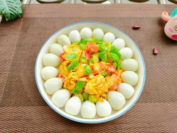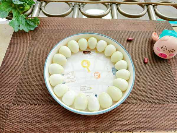 ③锅中烧水,放入一点盐,再倒入鹌鹑蛋。水开后煮4分钟,捞出来,剥掉蛋壳,摆在盘子中(也可以入锅一起炒)。