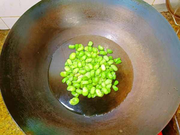 ②锅中烧水,水开后倒入蚕豆米。加点盐和食用油,保持蚕豆米翠绿不变色。焯水也可以去掉一部分豆腥味,加速蚕豆米快速软烂。蚕豆米用手一掰就断的时候捞出来,用冷水冲洗一下,保持菜色不变。