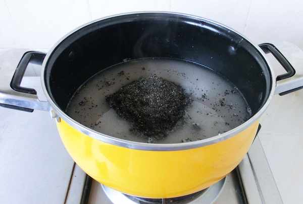8. 将糯米、黑芝麻煮至黏稠后,放入山药。