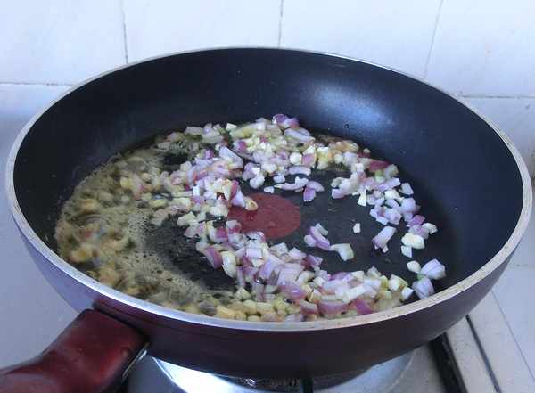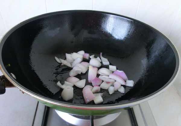 4.加入切好的蒜、红葱头碎,翻炒到红葱头碎开始焦糖化时。